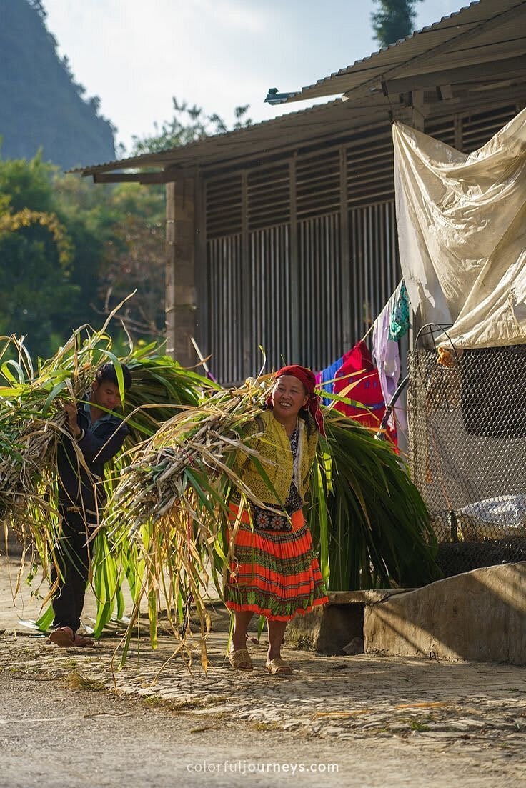 From the top view, there is a picturesque 360° panorama of Ma Pi Leng Pass. Once on the peak, you might feel overwhelmed by the majestic mountains and rivers. Then we continue to drive through the villages of Meo Vac, Mau Due, and Lung Ho, where our break for lunch is served.
